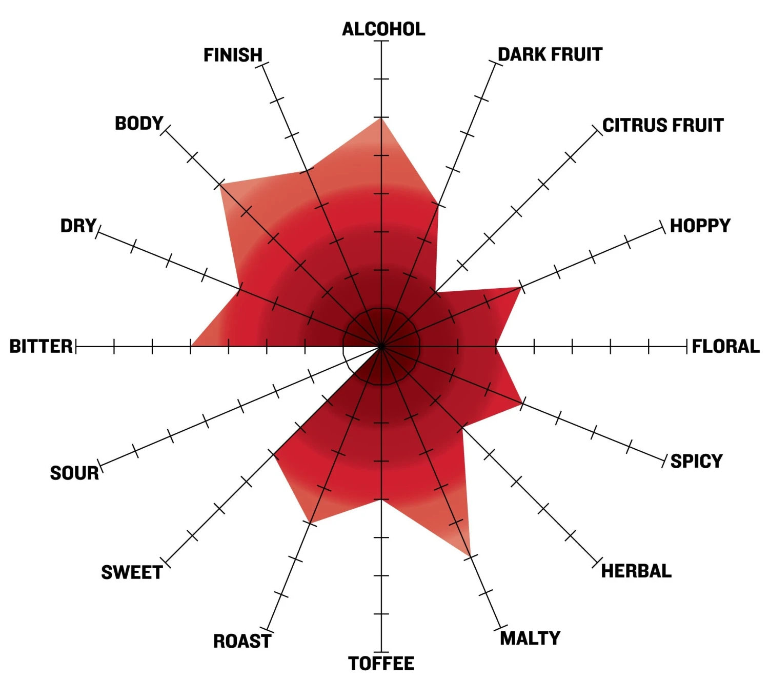 - Mouthfeel: Medium to medium heavy body with warming alcohol. Moderate carbonation.