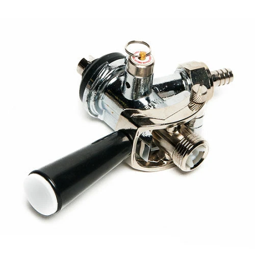 The keg coupler connects to the keg valve, “tapping” the keg. Both the gas line from the CO2 tank / regulator and the beer hose to the beer faucet attach to the coupler.