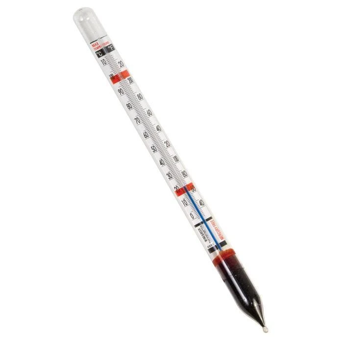 Reads in Celsius and Fahrenheit (-18°-104° C, 1° increments; 0°-220° F, 2° increments). Float it in a mash and leave it to equilibriate for convenient readings. Not recommended for boiling temperatures.