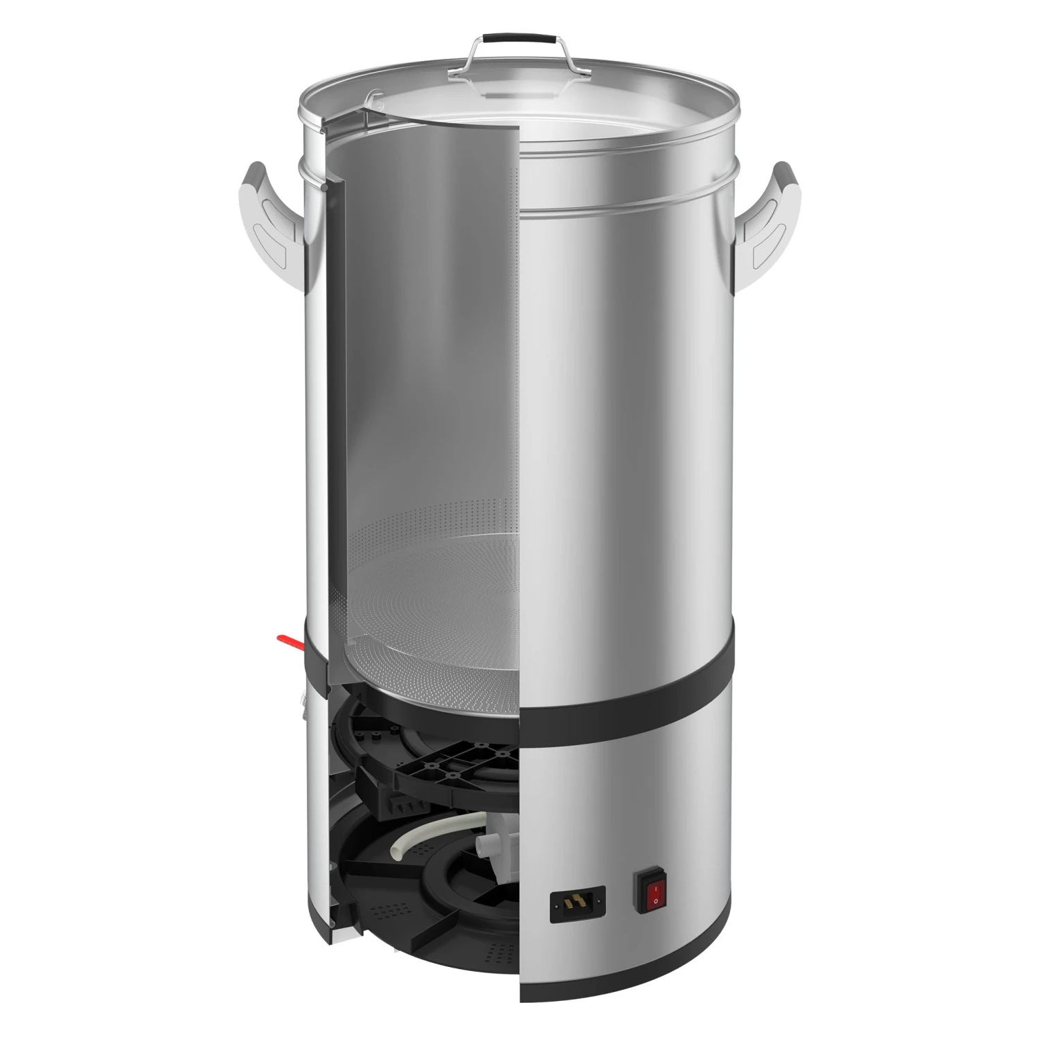 - Concealed conical heating element. The element covers 80% of the base and it’s mounted using thermal paste rather than braised. This increases heat efficiently, by minimizing heat loss in areas it’s not needed. The wide heating area minimizes hot spots and scorching. Most solids settle on the false bottom, not the elements, making clean up a breeze.