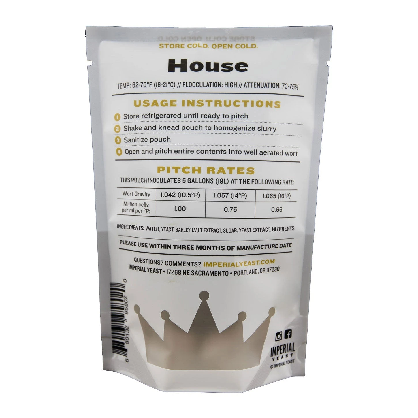 House yeast is clean and allows either malt and hops to shine. This strain is extremely adaptable and flocculent enough to drop out of the beer quickly. Best used in American IPAs but works well in English style ales. House produces clean, crisp finish at cold temperatures with increased esters if fermentation occurs at the top of its temperature range.