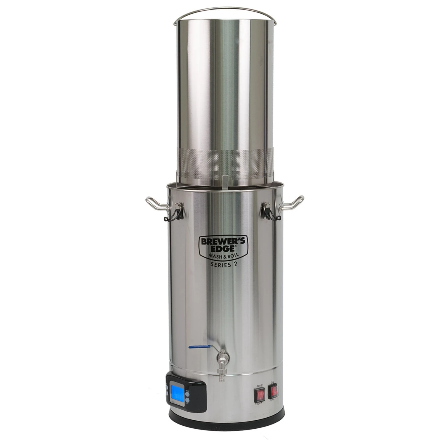 The all-new Brewer’s Edge Mash & Boil Series 2 is a single vessel, electric brewing system that lets you from 8 lbs. up to 16 lbs. of malt and boils up to 7.5 gallons with hardly any footprint. An internal sparging basket allows you to easily lift the grain out of the boiler, letting you mash and boil in just one vessel. Series 2 Mash and Boils include a new redesigned high flow basket that increases flow up to 150% and helps eliminate stuck sparges. The grain basket has also been designed to sit higher up during sparging to easily see the volume graduations.