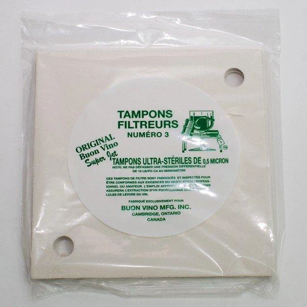 Three pack of #3 super sterile (approx. 0.5 micron) filter pads for the Buon Vino Super Jet. For best results, filter sequentially – first with #1 pads, then #2, and finally with #3.